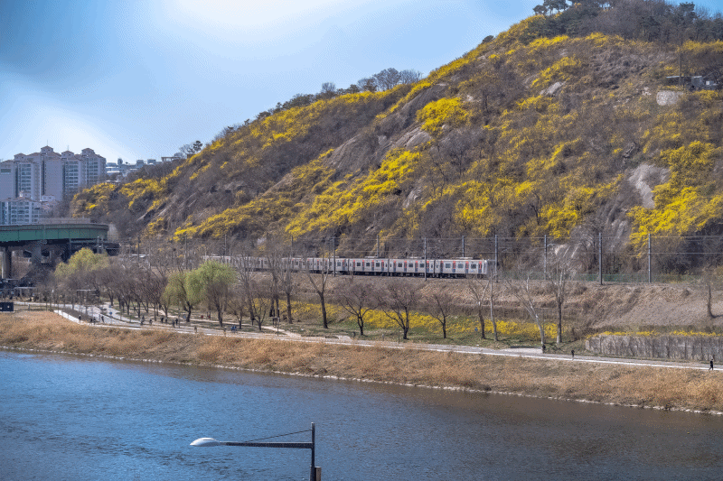 ● Cross Eungbong Bridge → Walk while looking at the Hangang River where forsythia blooms