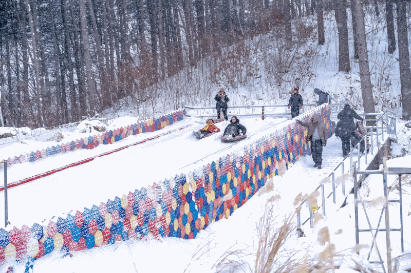 그리고 또 재미있던 게 눈썰매! 썰매를 타고 내려오는 게 생각보다 스릴 있었어. 길이는 그렇게 길지않았지만 속도감 있고, 눈이 푹푹 쌓여 있어서 넘어져도 하나도 안 아팠어. 아이들이랑 몇 번이고 올라가서 타고, 서로 누가 더 멀리 가나 내기도 하고, 진짜 한참을 놀았어.